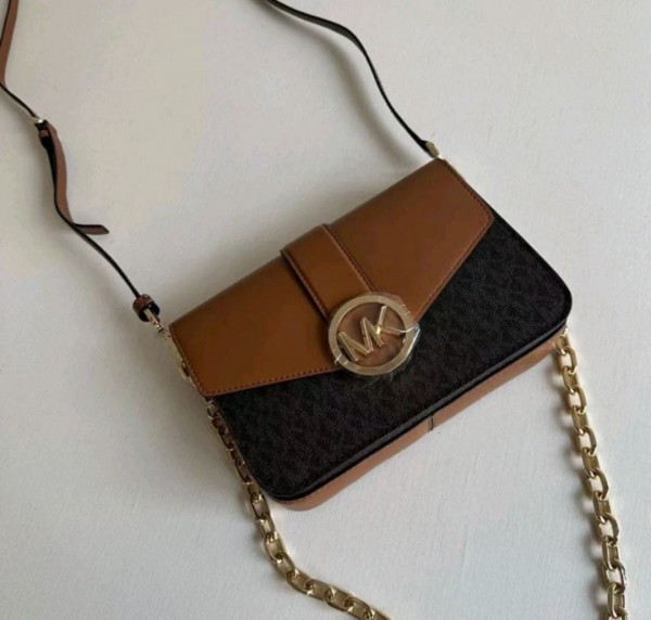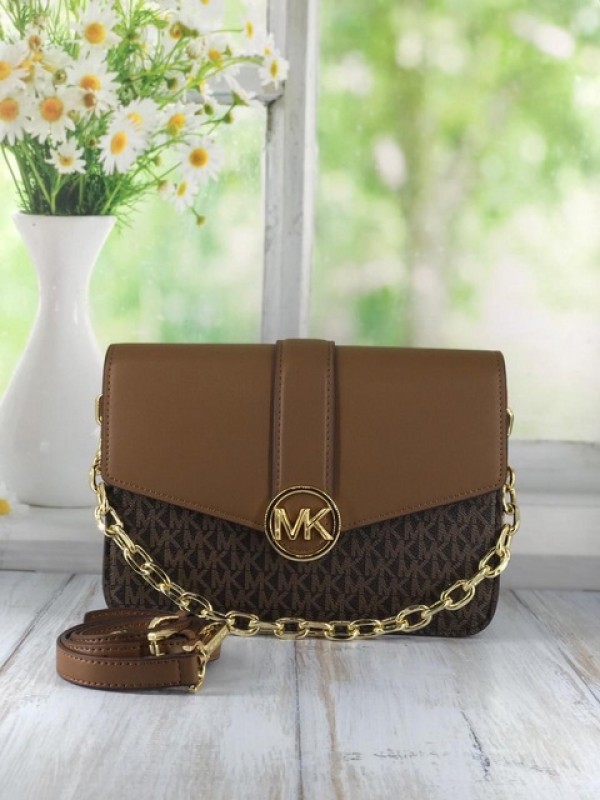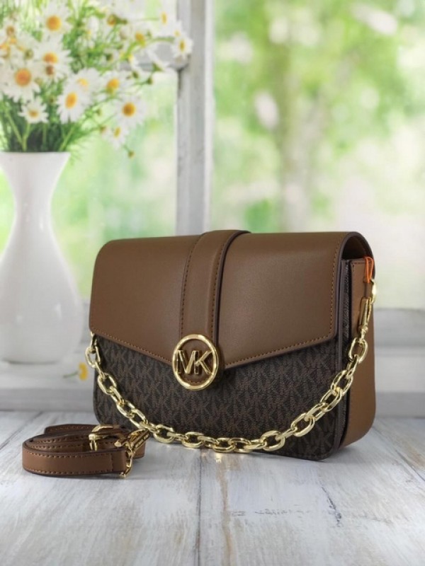 MichaelKors Womens Carmen Small Brown Signature PVC Leather Flap Crossbody Handbag For Women’s Bag